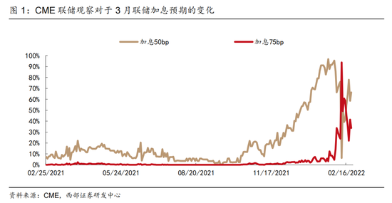 市场对于联储加息预期进入阶段性修正窗口。从市场对于联储加息节奏的预期来看,在2月上旬市场对于美国通胀快速上升的担忧之下,市场对于3月联储加息75bp的概率达到93.8%的极高水平,随着地缘政治引发的恐慌情绪,以及对于中期美国经济衰退风险的担忧,市场对于联储加息节奏正在重新评估,目前加息50bp正在逐步回归成为市场的一致预期。