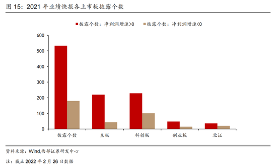 分上市板来看,科创板披露业绩个股数最多,主板净利润增速为正的占比最高。截止目前,科创板已披露业绩快报330家,主板263家,创业板63家,此外还有北交所57家。其中,已披露业绩快报中,主板披露的个股净利润占比最高,超过80%的个股实现正增长。
