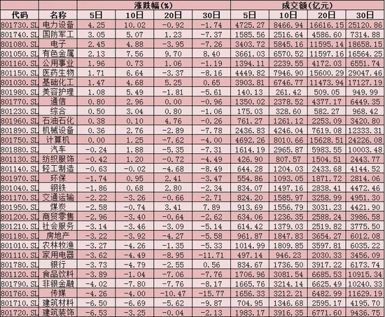 从申万一级行业来看,本周有12个行业实现上涨,其中,电力设备(4.25%)、国防军工(3.05%)、电子(2.45%)、有色金属(2.13%)等行业指数,累计周涨幅均超2%。另外,建筑装饰、建筑材料等行业指数周跌幅均超6%。