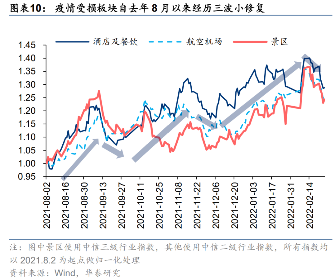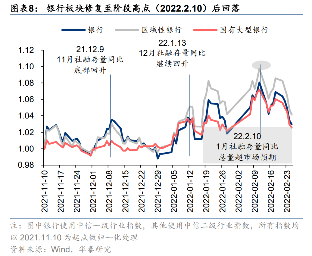 地产链自11.10修复至1.10后回落,当前核心问题是社融结构也即居民中长期贷款未改善;地产链与基建链交叉品种,走势与地产链更贴合;建筑板块自11.10修复至2.21回落,阶段高点同步于LPR未如期再降那天;银行板块自11.10修复至2.10回落,阶段高点同步于1月社融公布日;疫情受损板块自8.2修复至2.10回落,阶段高点同步于1月社融公布日+香港疫情加剧阶段,其中景区1月底至2月初弹性最大,意味着市场彼时的“宽防疫”预期打到了很高;电新指数、半导体指数已调整至21年6~7月相对景气驱动行情时期的水平;医药指数已调整至20年5月疫情修复初期的水平。
