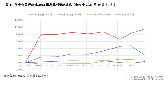 消费相关产业链预期盈利增速向好。去年年末以来,消费相关产业链2022预期盈利增速呈现调升趋势。生活服务产业链近两周预期增速调升幅度最大,2022年1月31日以来调升3.0%;医药产业链在2月中旬触底后预期盈利增速反弹,近两周调升0.5%;纺织服装产业链预期盈利增速近期保持稳定;必选消费产业链预期盈利增速有所下调,主要是2021年预期盈利增加导致。