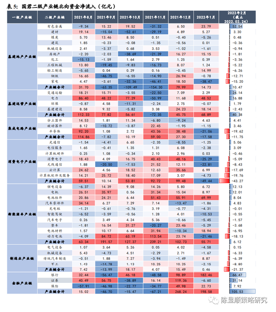 北向资金大幅流入背景下新能源车产业链存在微观交易结构恶化风险,而金融、基建产业链北向资金净流入增加。从北向资金流入来看,新能源车产业链北向资金净流入自2021年8月不断增加,存在较高的微观交易结构恶化风险。而此前北向资金净流出较多的基建、金融产业链近期北向资金净流入有增加趋势。具体来看,2022年2月以来金融、基建运营、基建地产等产业链北向资金净流入水平较高,截止至2022年2月24日北向资金净流入各105.53亿元、40.38亿元、10.47亿元。医药、消费电子、医药、必选消费等板块则有较大净流出,截止至2022年2月24日北向资金净流出各43.27亿元、43亿元、40.00亿元。