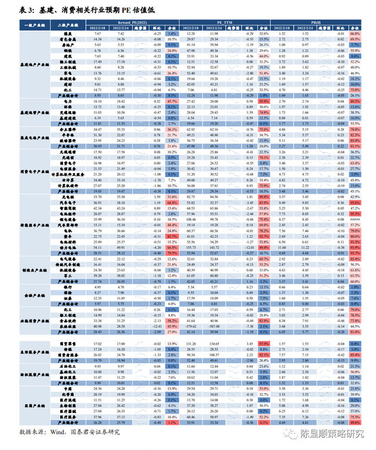机械设备、煤炭、农林牧渔预期ROE上调幅度较大。从国君一级产业链行业划分维度来看,集成电路产业链2022预期ROE调升幅度较大(0.4%)。由于ROE更多地反映行业的中长期特性,其余产业链预期ROE变化不明显。从国君二级产业链行业划分维度来看,近两周共计29个行业上调ROE预测,其中基建产业链的机械设备、煤炭和必选消费产业链的农林牧渔上调幅度较大,分别调升1.9%、1.1%和1.1%,主要受到稳增长信号进一步释放影响;电机、半导体预期ROE均调升0.7%。共计27个行业下调ROE预测,其中充电桩、分立器件等高估值行业下调幅度较大,分别调降4.3%、1.8%;基础化工、机械设备和轻工制造分别调降0.6%、0.5%、0.4%。