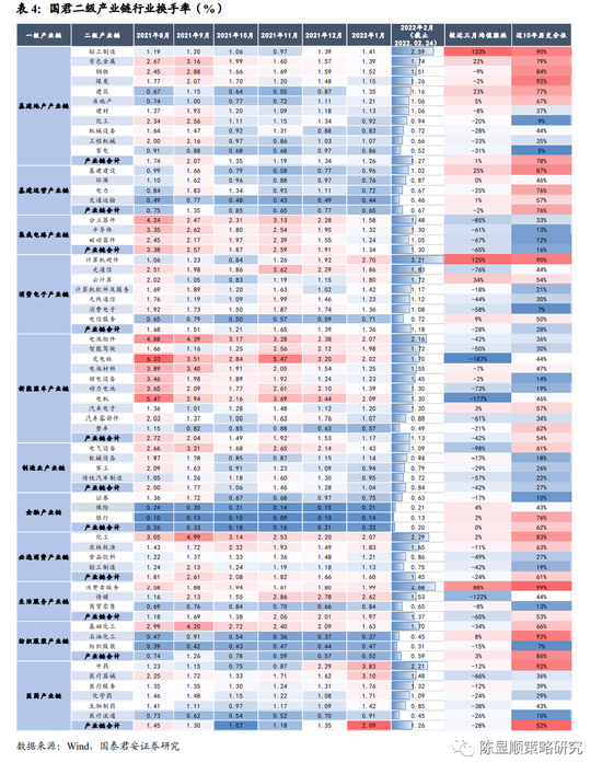 交易拥挤度较高的新能源车、集成电路等高估值产业交易活跃度下降,基建相关行业交易活跃度有所上升。以集成电路、新能源车产业链为代表的高估值成长赛道交易活跃度和拥挤度在2021年三季度达到了历史高位。近期受美联储缩表预期提前影响,高估值成长赛道交易活跃度逐渐下滑,充电桩、电机行业换手率较近三月均值下降187%、177%。而以轻工制造、建筑为代表的基建相关行业近期交易活跃度有所回升,其中轻工制造行业换手率较近三月均值上涨133%。