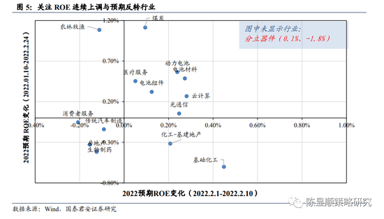 煤炭、动力电池等行业2022预期ROE连续上调,农林牧渔预期ROE反转。预期ROE边际变化方面,关注连续上调与预期反转行业。1)连续上调:煤炭、动力电池、医疗服务、电池材料、电池组件、云计算、光通信;2)连续下调:房地产、生物制药、传统汽车制造;3)预期反转(上期下调,本期上调):农林牧渔;4)预期回落(上期上调,本期下调):化工-基建地产,基础化工。