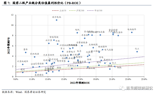 基建、金融产业链估值盈利性价比高于大盘。从预测PB-ROE来看,建筑、机械设备、基建建设、工程机械、煤炭、钢铁等基建产业链行业与银行、保险、房地产等金融产业链行业估值盈利性价比高于沪深300。以动力电池、电机、锂电设备为代表的新能源车产业链和分立器件、半导体、被动器件等集成电路产业链估值盈利性价比偏低。