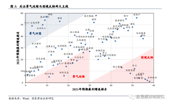 绝对盈利增速上来看,新能源、消费相关行业景气度较高。绝对盈利增速排名上,关注景气延续与困境反转两大主线。1)景气延续:动力电池、锂电设备、汽车电子、整车等新能源车产业链和化工-基建地产行业2021年预测盈利增速和2022年预测盈利增速均靠前;2)困境反转:农林牧渔、商贸零售、轻工制造等消费相关行业和光通信、智能驾驶、充电桩、电力等行业2022年预期盈利增速排名大幅上行,景气反转明显;3)景气回落:钢铁、煤炭、石油化工等资源品行业和化工-必选消费、基础化工等行业2022年预期盈利增速排名大幅回落。