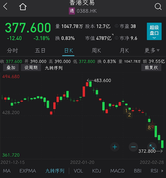 受港股去年成交活跃度影响,港交所年报业绩弱于部分机构预期,今日跌逾3%,股价出现8连跌,股价创2020年12月来新低。