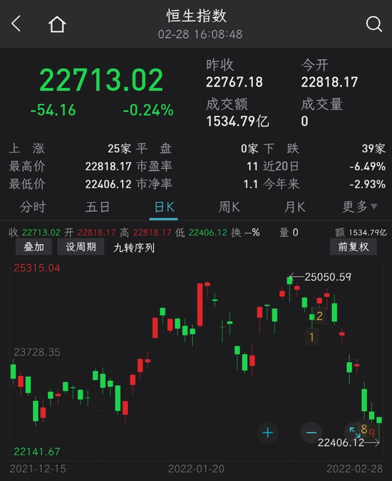 随着俄乌有望开启谈判,市场情绪回暖,恒指早盘收跌,盘中一度触及2020年来低点,但午盘走高,全天弱震荡跌0.24%,收于近两年新低。恒指国企、中企及科技指数收红。