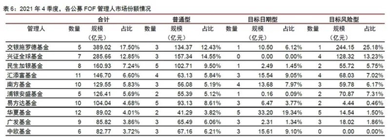 中信证券研报显示,截至2021年四季度,共有65家公募基金管理人有FOF产品运作,管理规模超100亿元的基金公司有7家,包括交银施罗德、兴证全球、民生加银、汇添富、南方、浦银安盛和易方达基金,其中规模前五的基金管理人合计市场份额为50.03%。