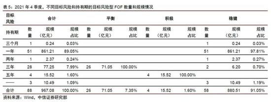 中信证券统计数据显示,截至2021年四季度末,养老目标日期型FOF产品共有66只,合计规模为169.08亿元;目标风险型FOF产品89只,合计规模为899.61亿元,总体规模突破了千亿元。但在其中,目标风险型FOF当前是养老FOF的主流。而在目标风险型FOF中,一年期产品占比高达89.05%,其中绝大部分是稳健型产品。
