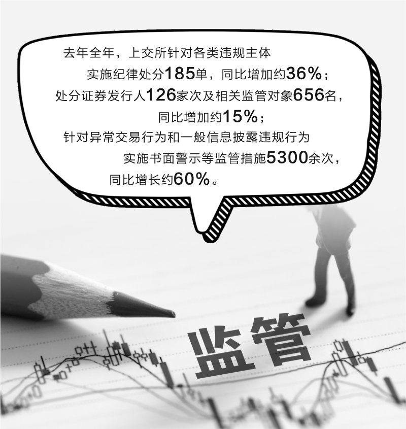 去年全年,上交所针对各类违规主体实施纪律处分185单,同比增加约36%;处分证券发行人126家次及相关监管对象656名,同比增加约15%;针对财务造假、资金占用、违规担保、“逃废债”、定期报告披露违规等典型、恶性案件的主要责任人员,作出公开谴责、公开认定不适格人选等处分决定50余次,同比增长约20%;针对异常交易行为和一般信息披露违规行为实施书面警示等监管措施5300余次,同比增长约60%。