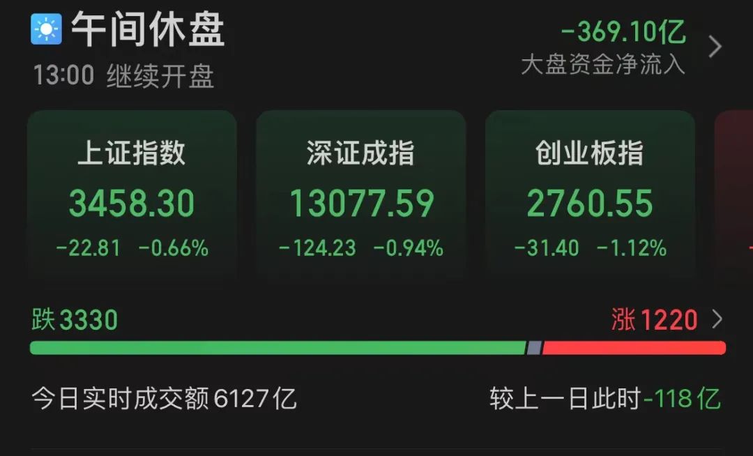 截至中午休盘,沪指跌0.66%,深成指跌0.94%,创业板指跌1.12%。两市半日成交额达6120亿元,沪股通早盘净流出7.66亿,深股通早盘净流出1.68亿。