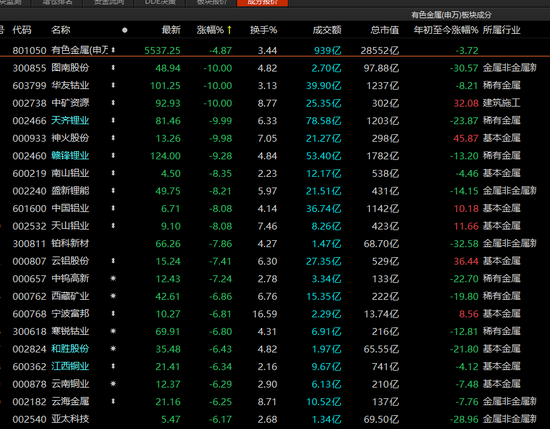 31个申万一级行业最后全部收跌,其中25个板块跌幅超过2%。煤炭、有色金属领跌,农林牧渔、医药生物跌幅超过4%。食品饮料和电力设备在尾盘也扛不住了,贵州茅台相对较稳,收涨2.71%报1753.2元/股,而宁德时代盘中振幅较大,最后涨幅缩至0.12%报455.45元/股。