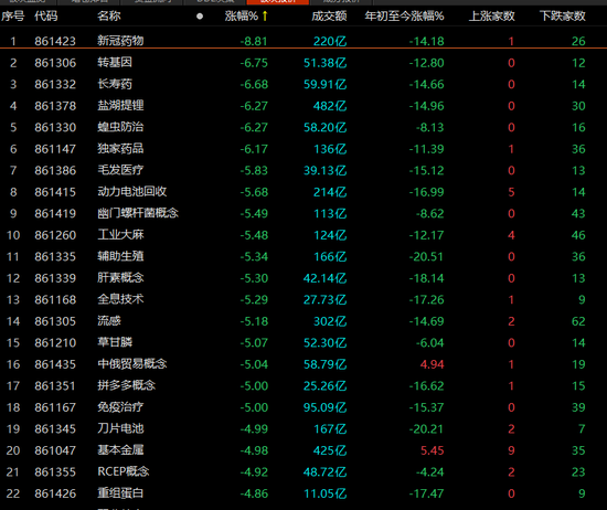 新冠药物、转基因、长寿药、盐湖提锂概念大跌。