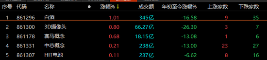 概念股方面,白酒概念板块涨幅收缩至1.01%,中芯概念、HIT电池微涨。
