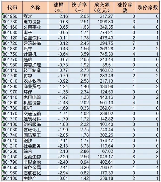 行业板块方面,仅3个申万一级行业上涨,其余行业均下跌。煤炭、电力设备、公用事业分别上涨2.16%、0.68%、0.65%;房地产、石油石化、有色金属、非银金融、医药生物等5个行业跌幅均超2.2%。