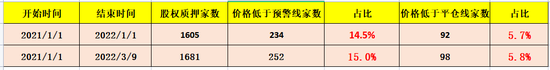 对比2021年1月1日至今年1月1日和2021年1月1日至今年3月9日的A股上市公司股权质押数量可以发现,无论是低于预警线家数的比例或者是低于平仓线家数的比例相差不大,整体股权质押风险没有随着市场的下跌产生明显的变化。