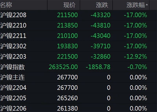 此外,在今日上期所暂停镍期货部分合约交易一天的情况下,部分沪镍合约跌停。