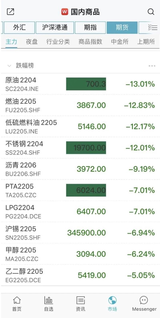 3月10日,国内商品期货大面积飘绿,原油、PTA、不锈钢均跌停。截至发稿,原油主力跌13.01%,报700.3元;不锈钢主力跌12.01%,报19700元;PTA主力跌7.01%,报6024元。