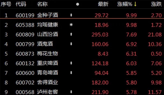 食品饮料板块连续两日反弹,金种子酒涨停,酒鬼酒、重庆啤酒、青岛啤酒、舍得酒业等涨幅居前。