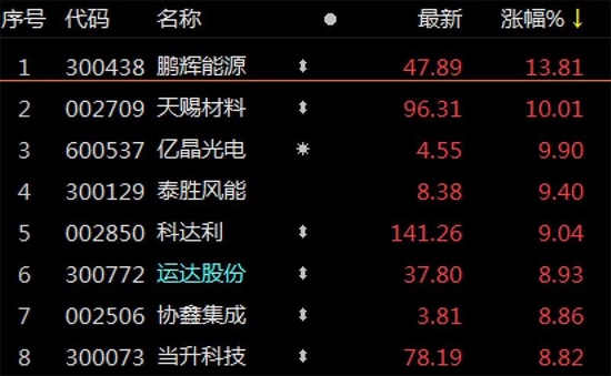 电力设备板块中,鹏辉能源涨超13%,天赐材料涨停,亿晶光电(维权)、泰胜风能等纷纷跟涨。