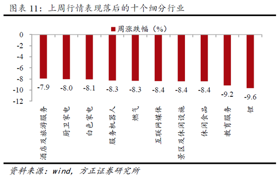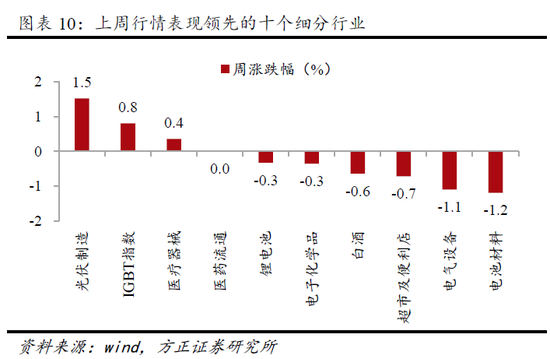从我们筛选的110个细分行业来看,上周行情表现领先的前5名细分行业及周涨跌幅分别是光伏制造(+1.5%)、IGBT指数(+0.8%)、医疗器械(+0.4%)、医药流通(+0.0%)、锂电池(-0.3%)。上周行情表现落后的后5名细分行业及周涨跌幅分别是锂(-9.6%)、教育服务(-9.2%)、休闲食品(-8.4%)、景区及休闲设施(-8.4%)、互联网媒体(-8.4%)。