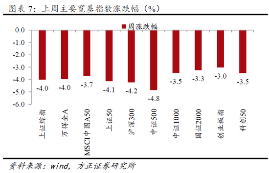 从主要宽基指数来看,上周A股市场主要宽基指数普遍下跌。具体来看,上周wind全A、上证综指、创业板指等指数单周跌幅分别为4.0%、4.0%和3.0%。上证50、沪深300、中证500和中证1000等规模指数单周分别下跌4.1%、4.2%、4.8%和3.5%,同样集体收跌。