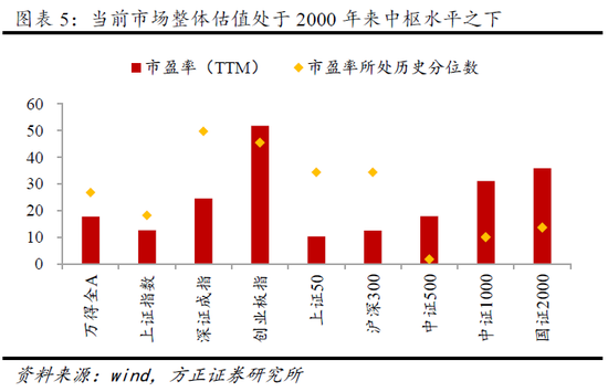 当前市场整体估值处于2000年来历史中枢水平之下。截至3月11日,wind全A市盈率为17.7,处于2000年以来自下而上26.8%分位数点。上证指数、深证成指、创业板指数市盈率分别为12.6、24.5和51.8,均处于2000年有数据以来中枢水平之下。此外上证50、沪深300、中证500、中证1000等规模指数估值同样处于2000年有数据以来平均水平之下。