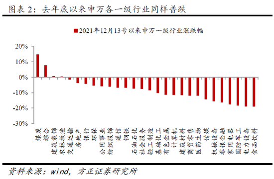 除煤炭行业逆势收涨外,申万各一级行业同样普遍收跌。据我们统计,2021年12月13号以来,申万31个一级行业中仅4个行业收涨,其余行业纷纷下行。其中煤炭、综合、建筑装饰和农林牧渔行业表现亮眼,分别上涨14.8%、7.7%、0.8%和0.5%。而汽车、电子、美容护理、食品饮料、电力设备等行业深度回调,去年12月13日以来累计跌幅分别为22.6%、20.8%、20.4%、19.1%和19.0%。