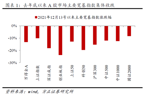 去年底以来A股市场主要宽基指数集体收跌。去年底以来受美联储加息预期升温、俄乌局势动荡加剧、商品价格大幅上行等因素影响,包括A股在内的全球股市均出现了显著的回调。据我们统计,2021年12月13号以来wind全A累计下跌13.2%,创业板指数累计跌幅达23.8%,上证50、沪深300、中证500、中证1000等规模指数同样集体收跌,且跌幅均在10个点以上。