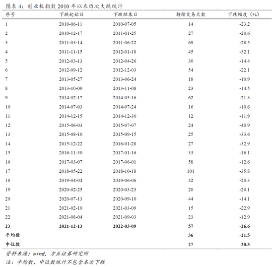 本轮市场尤其是创业板回调幅度在历史上已经十分靠前。我们统计了2010年以来上证指数和创业板指数历次大跌的情况,从统计结果来看,不包含本次,2010年以来上证指数共出现过17次较大幅度的回调,历次调整交易天数的中位数为44天,回调幅度中位数为15.4%。创业板指数2010年以来共出现过22次较大幅度的回调(不包含本次),且创业板指数历次调整交易天数的中位数为27天,回调幅度中位数为20.5%。因此综合来看,本轮市场尤其是创业板无论是回调幅度以及持续时间在历史上均已十分靠前。