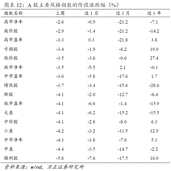 上周各风格指数同样普遍收跌,其中微利股、中盘股和中市净率股风格表现较差,跌幅居前。具体来看,上周高市净率、高价股和高市盈率股风格指数跌幅分别为2.6%、2.9%和3.3%,跌幅相对较小。而微利股风格指数单周下跌5.8%,表现垫底,中盘股和中市净率股风格表现同样靠后,单周跌幅分别为4.4%和4.3%。