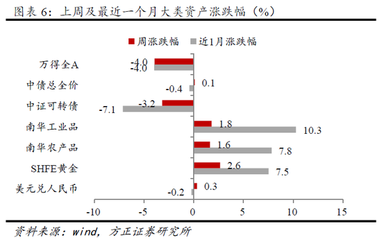 上周股票市场大幅回调,农产品、工业品及黄金价格有所走强,人民币兑美元汇率小幅贬值。具体来看,股票市场中,wind全A指数收跌,单周跌幅为4.0%。债券市场中,中债总全价指数环比小幅涨0.1%,中证可转债单周下跌3.2%。商品市场中南华工业品指数和农产品指数单周分别涨1.8%和1.6%。黄金价格上涨2.6%,人民币兑美元汇率小幅贬值0.3%。