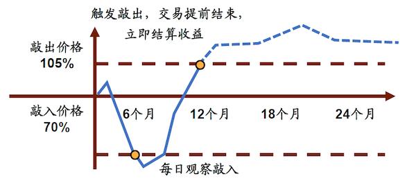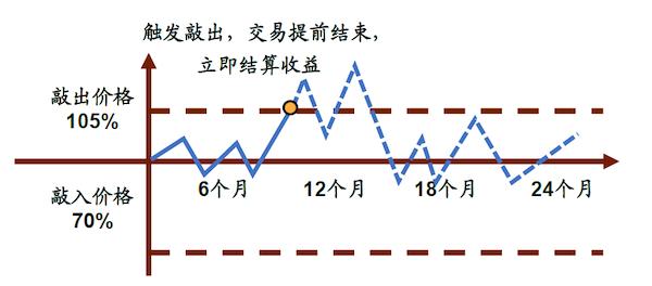 就敲出机制而言,若标的当天收盘价高于敲出价格,视为敲出。自动敲出后产品立即终止,敲出价格一般为期初价格的110%附近;敲入机制则是雪球产品的风险所在。一旦标的收盘价低于敲入价格,视为敲入。此时投资者开始承担价格波动风险,若此后未能再发生敲出,投资者承担相当于标的指数跌幅的损失。敲入后产品继续运作至到期或者触发敲出事件,敲入价格一般为期初价格的70%左右。