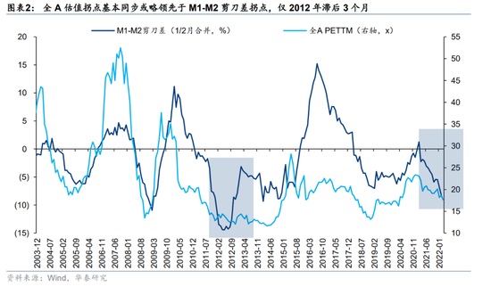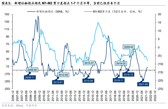 2月新增社融大幅低于Wind一致预期,但考虑春节错位效应带来的扰动,新增社融6个月移动平均增速(2月7.8% vs 1月6.6%)仍保持上行通道,参考过往六轮库存周期,社融底(去年8月)→估值底→盈利底(或现于中报)的传导依然清晰。相比于社融总量修复的斜率,A股节奏与社融的期限结构、资金的沉淀结构相关性更高,A股PETTM与M1-M2剪刀差基本同步见底,股权风险溢价与中长期贷款增速拐点也基本同步,即M1-M2剪刀差+中长期贷款“双拐点”来临时,A股或现估值底/情绪底/市场底。历史上新增社融拐点领先M1-M2剪刀差拐点1-7个月不等,目前已逾6个月。