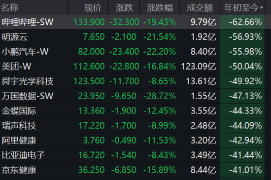 恒生成分股中,碧桂园系跌幅最甚,碧桂园服务跌21.48%,碧桂园跌18.88%;碧桂园称网上不公平负面陈述毫无根据,并会保留追究权利,但市场似乎并不买 帐。受国内疫情形势影响,海底捞跌17.98%,博彩股金沙中国跌11.59%,安踏、李宁跌均11%。恒生科技30只成分股中,当日跌幅超10%达16只,今年下跌超40%的已达11只。