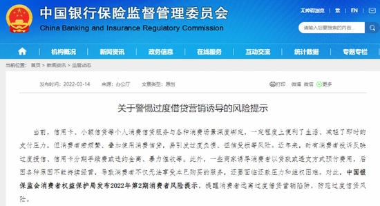 另一则来自银保监关于过度借贷消费的提示。今日,银保监会刊出风险提示,明确了四大营销诱导风险:诱导消费者办理贷款、信用卡分期等业务,侵害消费者知情权和自主选择权;诱导消费者超前消费;诱导消费者把消费贷款用于非消费领域;过度收集个人信息,侵害消费者个人信息安全权。