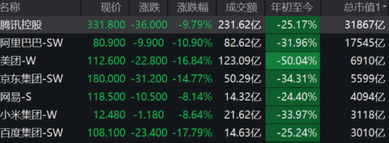 相较传统金融,互联网金融在面向终端客户的营销上,始终走在行业前列。美团跌16.84%、京东跌14.77%,阿里跌10.90%。另有消息传出腾讯或因支付业务受罚,尾盘快速走低,跌9.79%,股价创下自2020年来新低。
