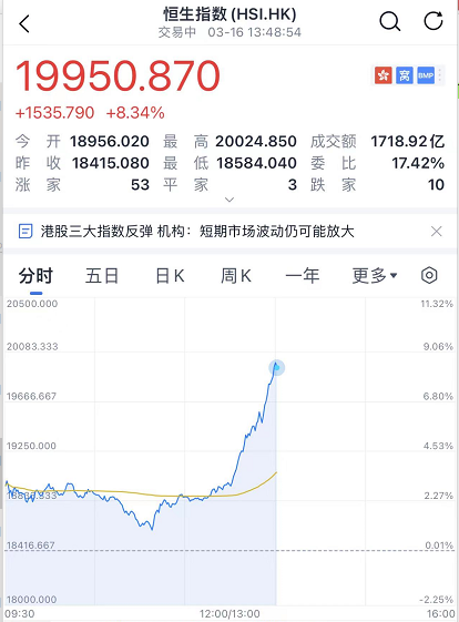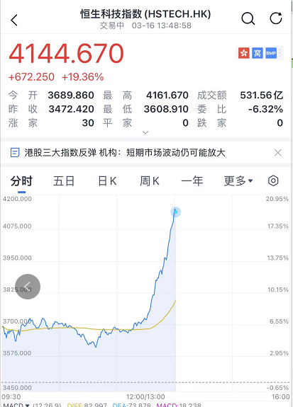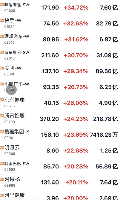 国务院金融委的消息出来之后,资本市场迅速响应,纷纷直线拉涨!恒生科技指数涨幅扩大至20%,为该指数推出以来盘中最大单日涨幅。腾讯控股、阿里均涨超20%,美团、京东集团、快手均涨超28%。