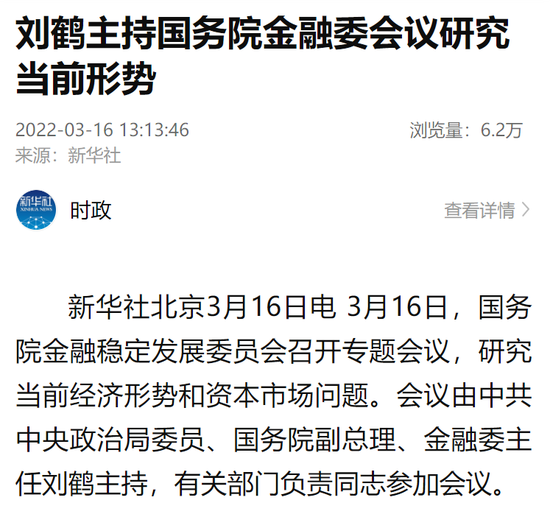 3月16日,国务院金融稳定发展委员会召开专题会议,研究当前经济形势和资本市场问题。会议由中共中央政治局委员、国务院副总理、金融委主任刘鹤主持,有关部门负责同志参加会议。