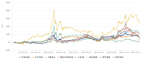 我们选取的指数分别是创业板指、万得全A、MSCI中国A50、中证500、上证50、沪深300、恒生指数以及恒生科技指数。