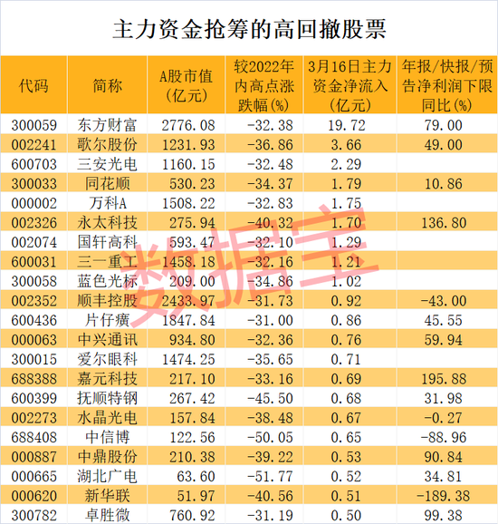 数据宝统计,最新收盘价与年内高点相比回撤幅度30%以上的股票中,21股今日获主力资金净流入超0.5亿元。千亿市值的行业龙头如东方财富、顺丰控股、片仔癀、万科A、爱尔眼科名列其中。东方财富最受主力青睐,单日净流入19.72亿元。该股今日成交明显放量,成交额达到132.2亿元,排在A股第二位,收盘涨幅10.42%。