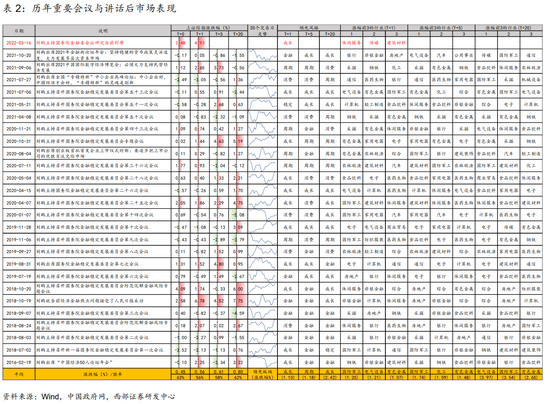金融委会议释放了维护金融市场平稳运行的积极信号。3月16日金融委会议召开后股市连续两日反弹,外资转为净流入,3月17-18日北向资金累计净流入118亿元。3月16日国务院金融稳定发展委员会召开专题会议,内容涉及宏观经济运行、货币政策发力、房地产企业风险应对、中概股、香港金融市场稳定、平台经济等市场关切的话题;会后一行两会、财政部、外汇局等各部委也纷纷表态提振市场情绪。上一次对市场信心尤为重要的金稳会还是在2018年,彼时受美联储加息、中美贸易摩擦以及经济下行压力影响,资本市场风险偏好恶化,上证指数全年累计下跌近25%。在2018年10月19日至20日,刘鹤就当前经济金融热点问题接受了人民日报采访,并主持召开国务院金融稳定发展委员会防范化解金融风险专题会议,随后一系列利好股市政策陆续出台,包括允许理财子直接购买股票、科创板设立等,政策底的出现也有助于后续市场逐步企稳。往后看,当前实体经济需求偏弱,金稳会提出“货币政策要主动应对,新增贷款要保持适度增长”,稳增长目标的实现仍需要政策的进一步加大支持力度,二季度仍是降息降准窗口期。从市场表现来看,在近年重要会议与讲话释放积极信号后资本市场表现也相对积极,1、5、20个交易日内上证指数上涨的概率超过56%,以电气设备与国防军工为首的成长风格相对占优。其中在2018年10月金融风险专题会议召开的20个交易日内,上证指数累计上涨了6%,大类风格中成长板块领跑,表现较好的行业为综合、房地产与计算机等行业。