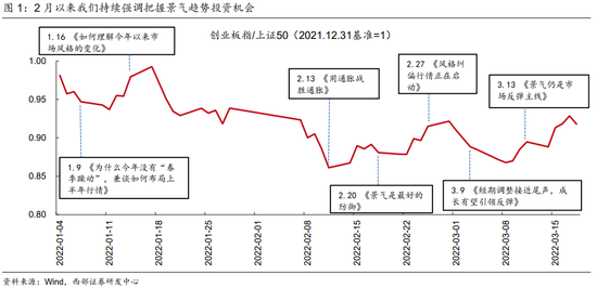 景气仍然是最好的防御。我们在2月13日报告《用通胀战胜通胀》中前瞻指出,“市场已经从对于高估值股票的交易拥堵快速切换到对于低估值的股票的热捧。这样一个过程也能已经达到一个较为极致的水平,后续市场将逐步回归均衡。”2月20日报告《景气是最好的防御》,我们再次强调,“在上半年市场整体环境更加友好的背景下,把握景气趋势将是更加积极的防御方式。”在2月28日报告《风格纠偏行情正在启动》中我们指出“宏观流动性预期正在修复”,“年报业绩窗口期是市场由混沌走向有序的契机”,在3月9日,市场情绪陷入冰点时,我们发布报告《短期调整接近尾声,成长有望引领反弹》,提示市场吃饭行情的到来,3月13日,我们在报告《景气仍是市场反弹主线》中强调“风格纠偏行情已经在调整中悄然展开”,本周市场虽然仍有反复,但是成长风格显著强于市场,景气的防御性得到充分体现。展望未来,随着上半年政策窗口期的打开,风格纠偏行情正在逐步展开,投资者仍然可以更加积极一些。