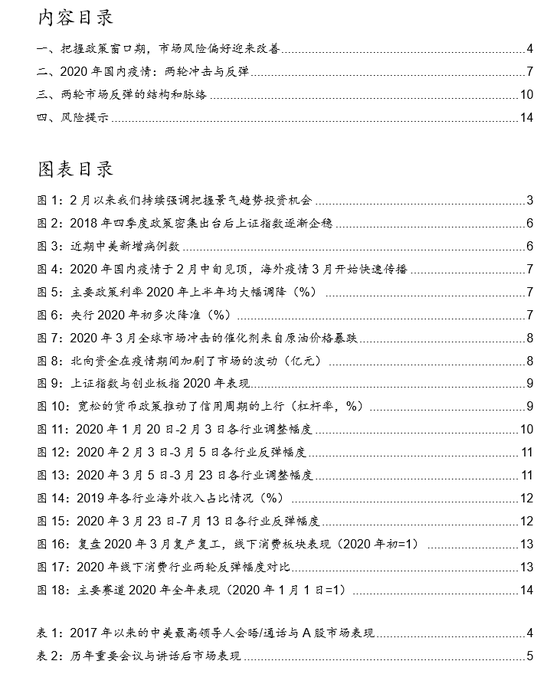 我们复盘了2020年国内和海外两次疫情冲击后的A股市场,除了成长风格外,线下经济复苏与必须消费品往往引领市场反弹。从市场来看,2020年春节后A股整体调整,但是随后快速收复跌势,之后受到海外市场影响虽然有二次探底,但是不同指数所受影响有所区别。过去国内和海外疫情反复后,往往伴随着长期经济预期下修,货币政策整体趋宽,成长表现相对都会占优。除此之外,包括农林牧渔和社服等行业的反弹力度都值得关注。当前来看,海外疫情暂处低位,国内疫情高峰可能已经过去,市场有望回归对于经济修复预期。但是值得关注的是2020年仍然处在信用周期的上升期,疫情短期扰动并未改变市场趋势,而当前处于信用周期筑底阶段,疫情过后仍然需要关注未来信用环境的边际变化。