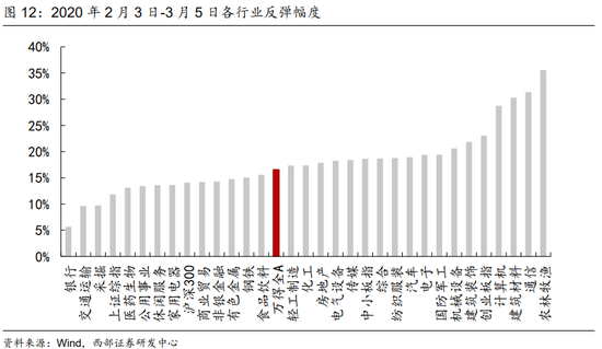 第一轮市场反弹主要交易逻辑在于疫情后的经济重建。2月18日,国务院总理李克强主持召开国务院常务会议,会议强调,当前统筹做好疫情防控和经济社会发展工作,一项迫切任务是稳就业。这引发了市场对于新一轮托底政策的无限遐想,包括传统基建相关的建筑建材,和与新基建相关通信和计算机等,都取得了相当不错的超额收益,但是年度维度来看,这些预期最终并未得到兑现。另外一个值得关注的是,在消费品中,唯一一个反弹超过疫情前水平的行业是农林牧渔,由于第一轮疫情冲击始于2020年春节前,这也是传统餐饮和家庭肉制品需求的旺季,而全国性的封城也导致了生猪运输和需求的渠道被阻塞,大量原本应该在春节旺季期间投放市场的生猪供给只能在生产地就地消化,使得行业出现恐慌性抛售。而随着疫情的修复,低存栏+春节期间的生产中断,叠加需求端的恢复,成为了推升春季猪肉价格反季节性上涨的动力,也引发了农业板块的强势反弹。