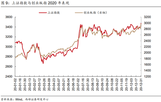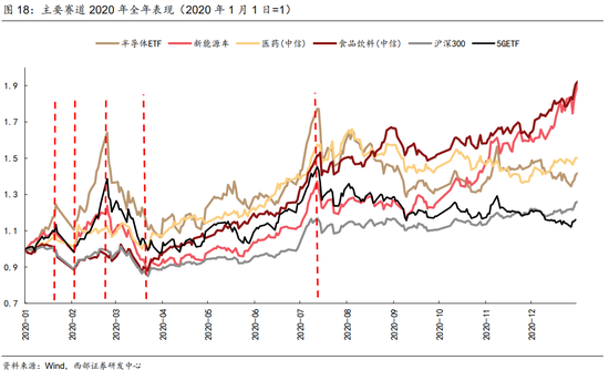 全年来看,2020年食品饮料和新能源为最大赢家,半导体和医药后程乏力,新基建出道即巅峰。从2020年整体的市场表现来看,无疑食品饮料是最强势的,这一表现也一直延续到了2021年春季,而新能源则是在国内政策和海外景气的双重带动之下延续了强势的表现,而在半导体和医药在业绩的支持下整体表现强于指数,而在疫情期间被市场寄予厚望的新基建,则是泯然众人矣。短期市场更多交易的政策与流动性预期,但是从更长的时间维度来看,业绩才是决定市场表现的核心因素。