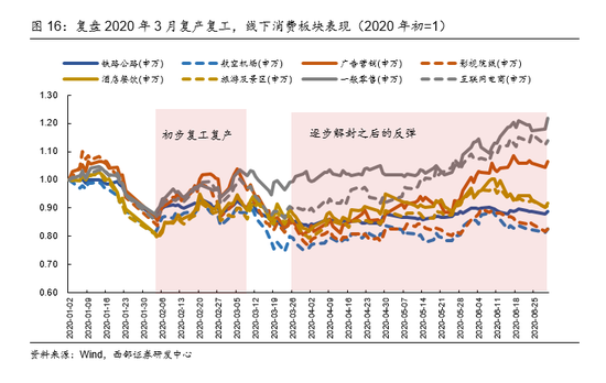 二是对比线下消费场景相关板块的反弹力度强弱,市内消费场景板块 > 受制于长距离移动的板块>疫情管控更严格的板块,即与消费场景的复苏快慢有直接关联。具体来看,广告营销、互联网电商、一般零售、餐饮等,与市内消费场景关联度更大,与日常生活更相关,且基本不受制于长途旅行的板块反弹力度较大;而铁路、航空、旅游、影视等,受制于长距离移动或疫情管控放松相对较晚的行业,反弹力度相对较弱,且反弹时间也相对靠后。