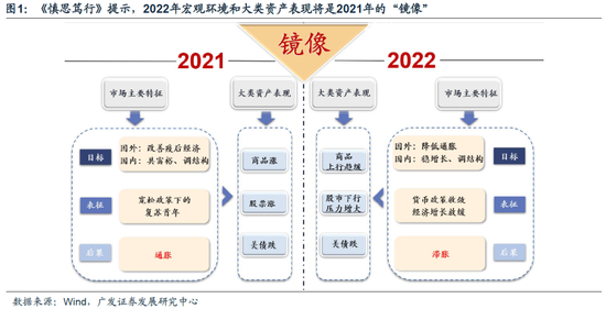 我们在去年12月《慎思笃行》判断:2022年宏观环境将转向“滞胀+收紧”。我们在21.12.5《慎思笃行——2022年A股年度策略展望》中判断:2022年宏观环境将转向“滞胀+收紧”,大类资产或将呈现商品上行趋缓、股市下行压力增大、美债利率上行的组合,整体表现预计是2021年的“镜像”。2021年海外基本处于疫情冲击后的复苏首年,“修复经济”依然是多数国家的主要目标。因此美联储、欧央行等政策主体在大部分时间内依然延续了疫情期间十分宽松的货币政策,而经济复苏和宽货币则推动了通胀持续上升。2022年,我们认为海外的宏观环境将从“通胀+宽松”转向“滞胀+收紧”,全球经济增长回落而通胀会维持高位,美联储可能将面临不得不加快加息节奏以应对通胀压力的困境。